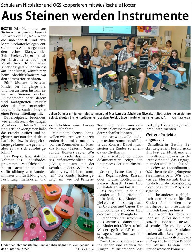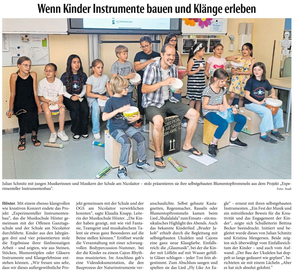 Mit einem ebenso klangvollen wie kreativen Konzert endete das Projekt „Experimenteller Instrumentenbau“, das die Musikschule Höxter gemeinsam mit der Offenen Ganztagsschule und der Schule am Nicolaitor durchführte.