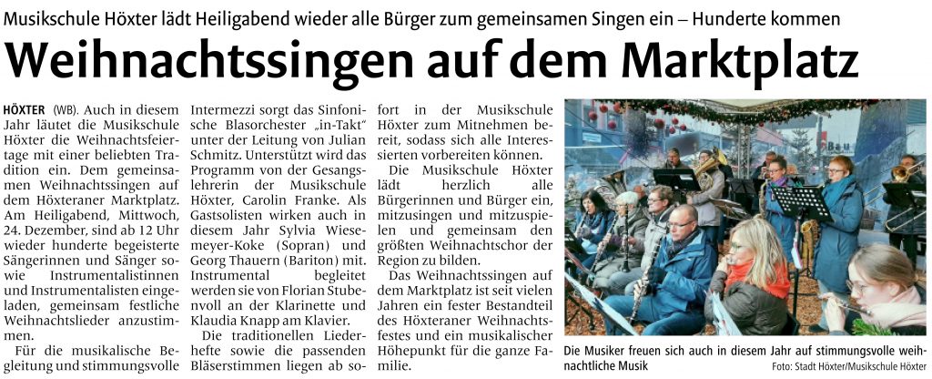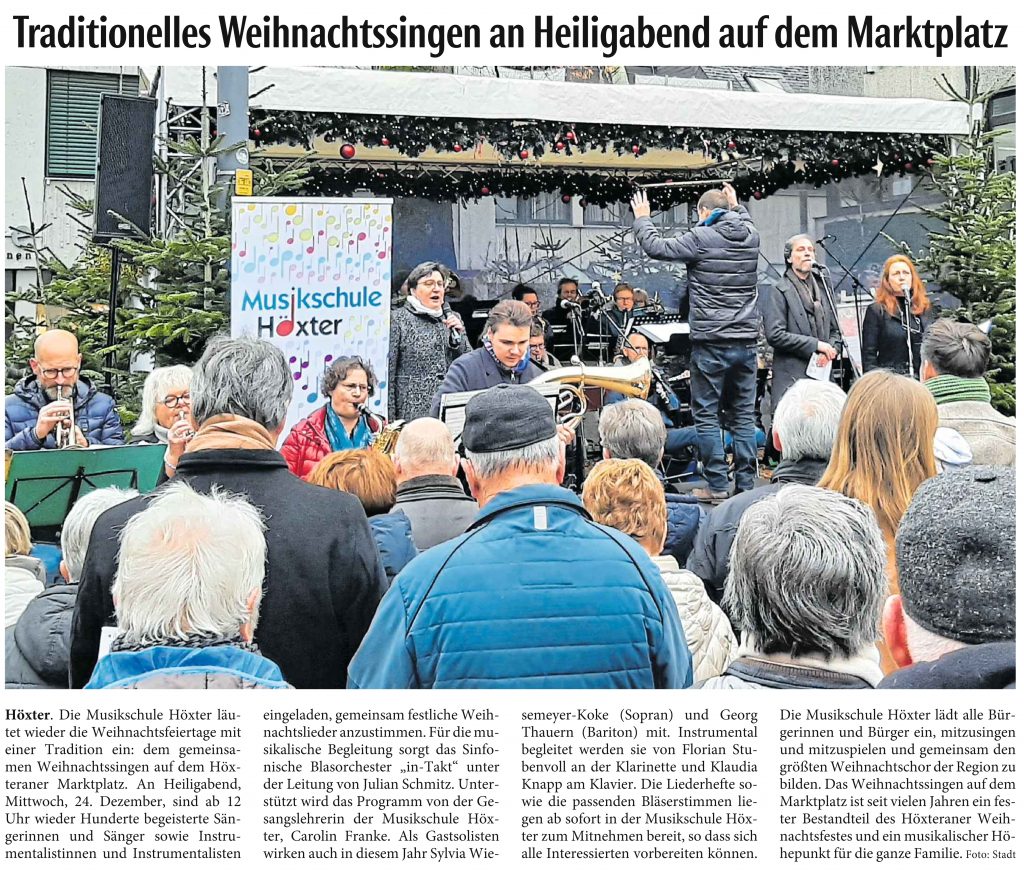 Die Musikschule Höxter läutet wieder die Weihnachtsfeiertage mit einer Tradition ein: dem gemeinsamen Weihnachtssingen auf dem Höxteraner Marktplatz.