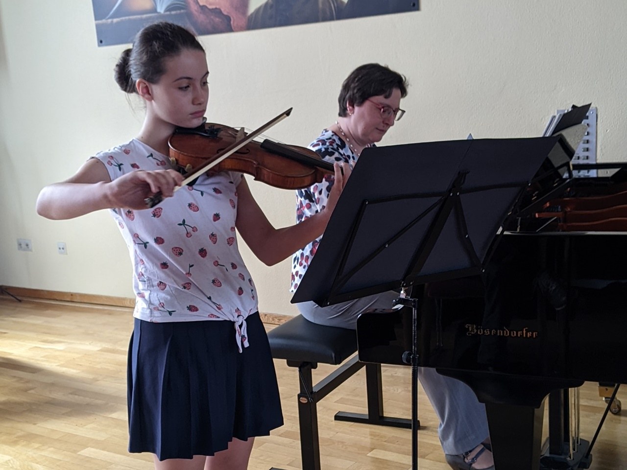 Die frischgebackenen Preisträger des Regionalwettbewerbes „Jugend musiziert“ Josefine Rabcenko und Philipp Bollack, nutzten die Gelegenheit, sich vor dem heimischen Publikum zu präsentieren. Mit einer kleinen süßen Überraschung gratulierte die Musikschulleiterin, Klaudia Knapp zu dem großen Erfolg.