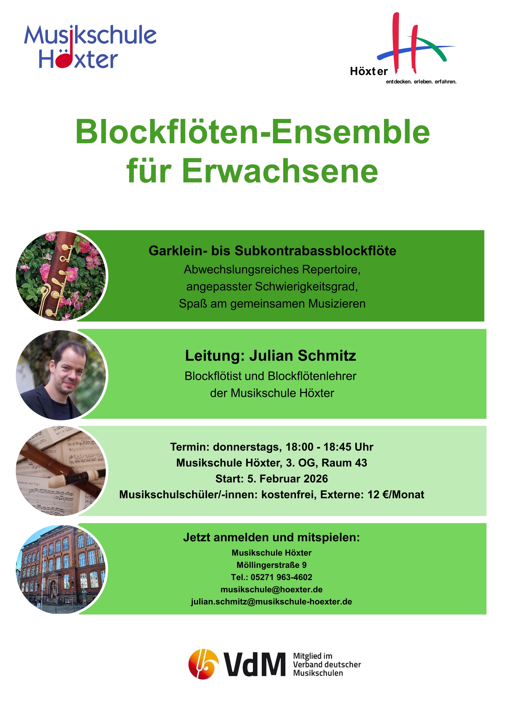 Ab Februar 2026 erweitert die Musikschule Höxter ihr Ensemble-Angebot: Dann startet ein neues Blockflötenensemble für Erwachsene unter der Leitung von Julian Schmitz, Lehrer für Blockflöte an der Musikschule.