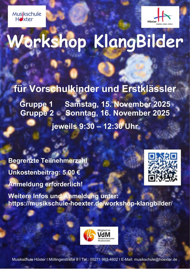Entdeckt mit uns die faszinierende Welt der Farbklänge und Klangfarben bei unserem Kinderworkshop „KlangBilder“! An diesem Workshoptag werden die Kinder gemeinsam musizieren und dazu mit Pinseln, Stiften und Kreiden auf großen Leinwänden farbenfrohe Klangwelten erschaffen. Dabei erforschen sie laute Pinselstriche und sanfte Farbtupfer, erleben die Wirkung von feurig roten oder beruhigenden blauen Klängen und nutzen Musikinstrumente als lebendige Inspiration für ihre Kunstwerke – eine spannende Verbindung von Musik und Malerei für ein kreatives Wochenende voller Farbe und Klang.